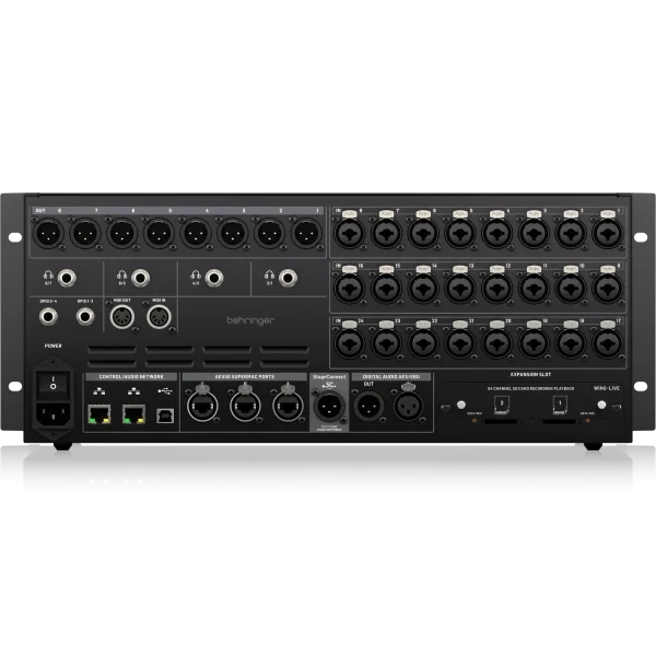 La WING RACK integra 24 preamplificadores Midas PRO de alta gama, además de ocho salidas XLR y cinco salidas de auriculares TRS de 1/4”. La conectividad se expande mediante tres puertos AES50 SuperMAC, el puerto StageCONNECT, y tarjetas opcionales de expansión que permiten interfaces de audio adicionales, redes digitales, MADI o ADAT/WC. Asimismo, ofrece cinco ranuras de procesamiento dinámico para los 40 canales estéreo de entrada. Cada ranura admite complementos basados en clásicos compresores y ecualizadores analógicos, junto con una ranura dedicada para efectos de inserción y un ecualizador paramétrico de 4 bandas en los 8 canales auxiliares estéreo.